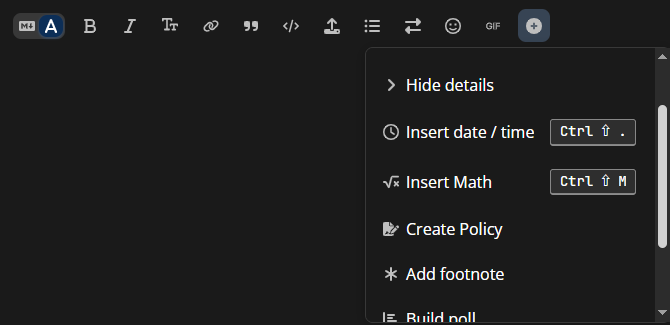 Note: The UI elements described here are present in Rich Text Editing mode, you can swap between Rich Text and Markdown on the left-most toggle above the text box where you write your post