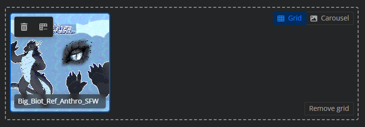 To add more images to the grid, you will need to upload them as before, and drag them inside the box that was created when the grid was added. Alternatively, you can also press “Add to grid“ on images, and if they are adjacent to a grid, they will be added to it. To swap between grid and carousel view, you may use the toggle on the top right.