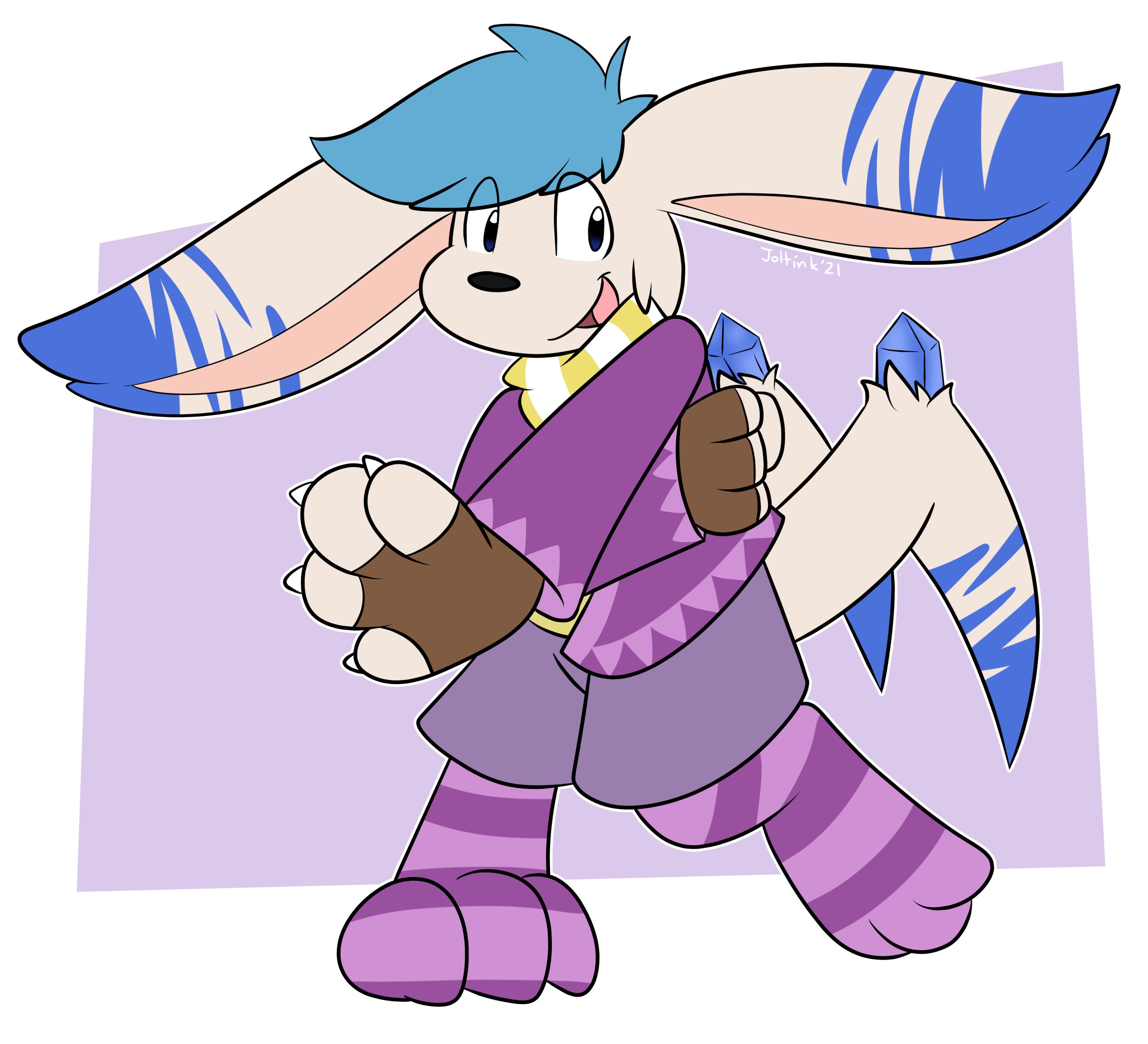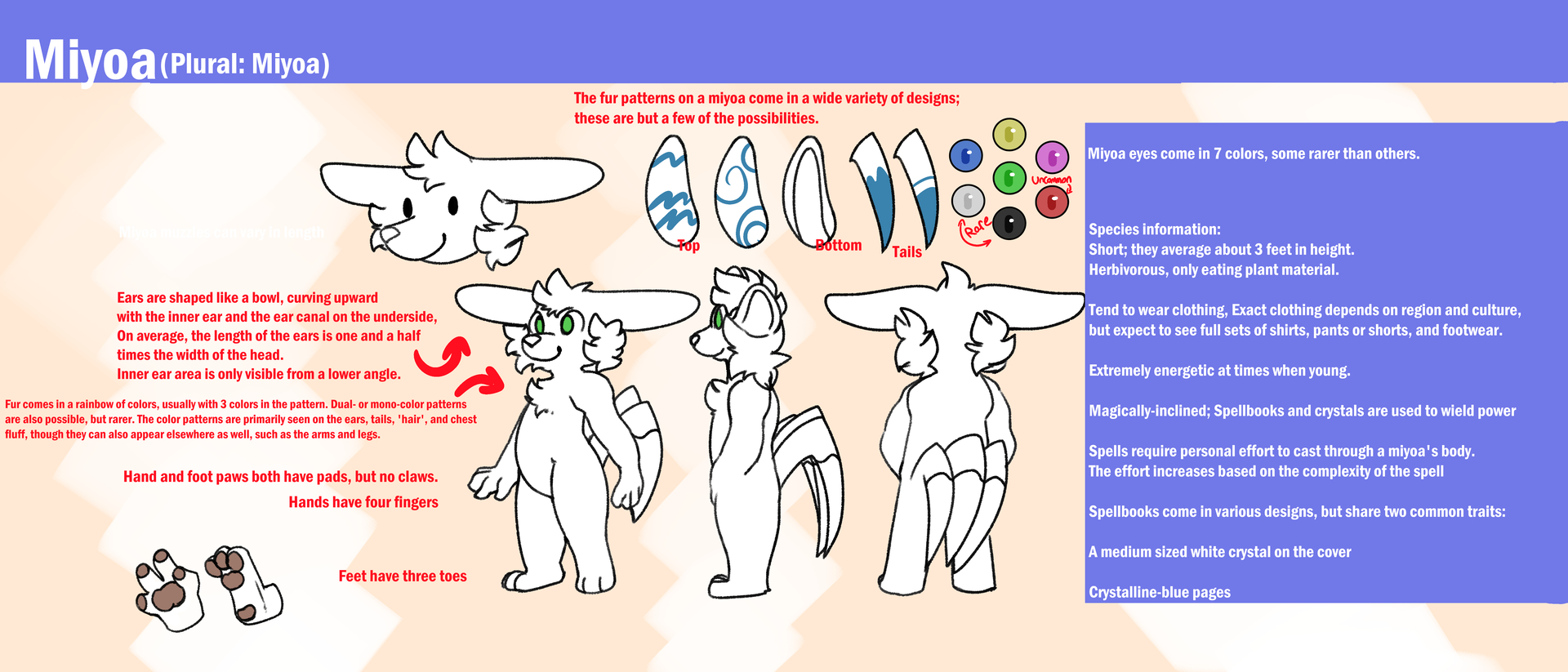 Miyoa come in many different body shapes and colors - pretty much a rainbow! Their fur patterns can be intricate and complex, typically between 2-4 distinct colors, and primarily localized to the ears and tails, though body patterns are common as well. Their eyes can be one of seven colors: Yellow, blue, green, violet, red, white, and black, with red being uncommon, and white and black being extremely rare. Their ears are incredibly long, typically no shorter than twice the width of their head, and tend to be sensitive; a miyoa’s ears will twitch when they sense strong changes to the nearby magical field, alerting them to spells being cast nearby or magical storms. The tails are the second-most striking part of a miyoa; they have three long tails that sharply curve inward halfway down their length, making them resemble the head of a scythe. Though covered in fur, the very tips can be surprisingly pointy, and thus useful for self-defense.